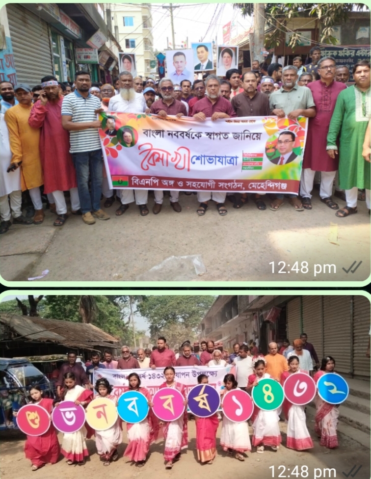 এদিকে সকাল ১০ টায় বাংলা নববর্ষকে স্বাগত জানিয়ে বৈশাখী শোভাযাত্রা করে মেহেন্দিগঞ্জ উপজেলা এবং পৌর বিএনপির নেতাকর্মী সদস্যবৃন্দ। মেহেন্দিগঞ্জ বিএনপি'র শোভাযাত্রায় দলীয় প্রধান প্রয়াত রাষ্ট্রপতি জিয়াউর রহমান, বিএনপি চেয়ারপারসন বেগম খালেদা জিয়া, বিএনপির ভারপ্রাপ্ত চেয়ারম্যান তারেক রহমান, মেহেন্দিগঞ্জের সন্তান জাতীয়তাবাদী স্বেচ্ছাসেবক দলের কেন্দ্রীয় নির্বাহী কমিটির সাধারণ সম্পাদক রাজিব আহসান এর ছবি সহ বিভিন্ন বৈশাখী প্লাকার্ড ফেস্টুন হাতে নিয়ে মিছিলকে শোভামণ্ডিত করে মেহেন্দিগঞ্জের যুবদল, ছাত্রদল, স্বেচ্ছাসেবক দল, শ্রমিক দল, কৃষক দল, মহিলাদলের নেতা কর্মী সদস্য বৃন্দ। মেহেন্দিগঞ্জ বিএনপি'র শোভা যাত্রাটি উপজেলার বিভিন্ন গুরুত্বপূর্ণ সড়ক প্রদক্ষিণ করে পাতারহাট গার্লস স্কুল মাঠ প্রাঙ্গনে এসে পথ সভার মাধ্যমে শেষ হয়। মিছিল শেষে পথসভায় বক্তৃতা প্রদান করেন উপজেলা বিএনপির আহবায়ক গিয়াস উদ্দিন দিপেন, পৌর বি এন পির আহবায়ক রিয়াজ শাহিন লিটন, সদস্য সচিব রিয়াজ উদ্দিন চৌধুরী দিনু মিয়া, সিনিয়র যুগ্ন আহবায়ক আসাদুজ্জামান মুক্তা, উপজেলা যুবদলের সদস্য সচিব মাঝহারুল ইসলাম পারভেজ, পৌর যুবদলের আহবায়ক আমিনুল ইসলাম মামুন, স্বেচ্ছাসেবক দলের আহ্বায়ক ফখরুল ইসলাম সোহেল, ছাত্রদলের আহ্বায়ক সোহাগ সরদার, মহিলা দল উত্তর জেলার আহ্বায়ক চৌধুরী শরিফা নাসরিন সহ বিভিন্ন নেতৃবৃন্দ। পথসভা শেষে দলীয় নেতাকর্মীদের মাঝে বাংলার চিরাচরিত ঐতিহ্য পান্তা ভাত, বিভিন্ন ভর্তা ভাজি ও মরিচ ভোজনের মধ্যদিয়ে পান্তা উৎসব পালন করে দলের নেতা কর্মী সদস্যরা।