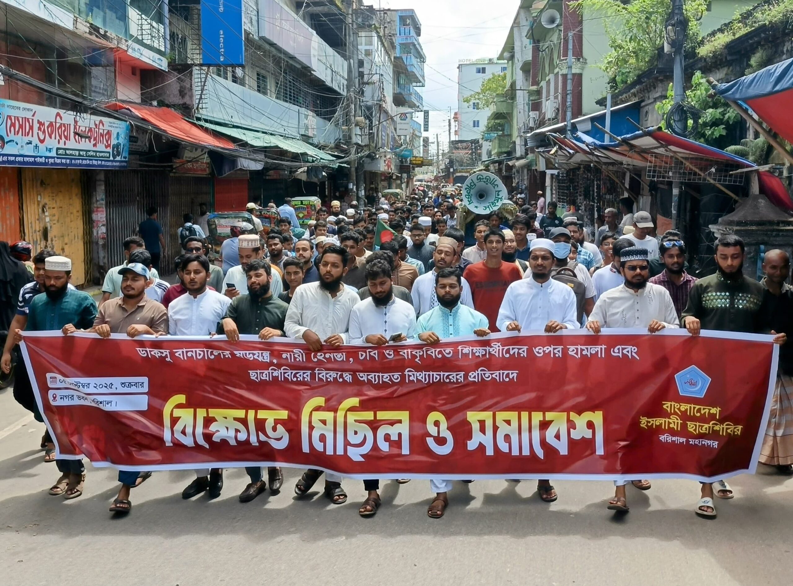 ডাকসু বানচালের ষড়যন্ত্র, নারী হেনস্তা, চবি ও বাকৃবিতে শিক্ষার্থীদের ওপর হামলা এবং ছাত্রশিবিরের বিরুদ্ধে অব্যাহত মিথ্যাচারের প্রতিবাদে বিক্ষোভ মিছিল ও সমাবেশ করে বাংলাদেশ ইসলামী ছাত্রশিবির বরিশাল মহানগর শাখা। ৫ সেপ্টেম্বর সকাল ১০:৩০টায় মিছিলটি নগর ভবন থেকে শুরু হয়ে গীর্জা মহল্লা প্রদক্ষিণ করে টাউন হল চত্বরে সমাবেশের মাধ্যমে শেষ হয়।