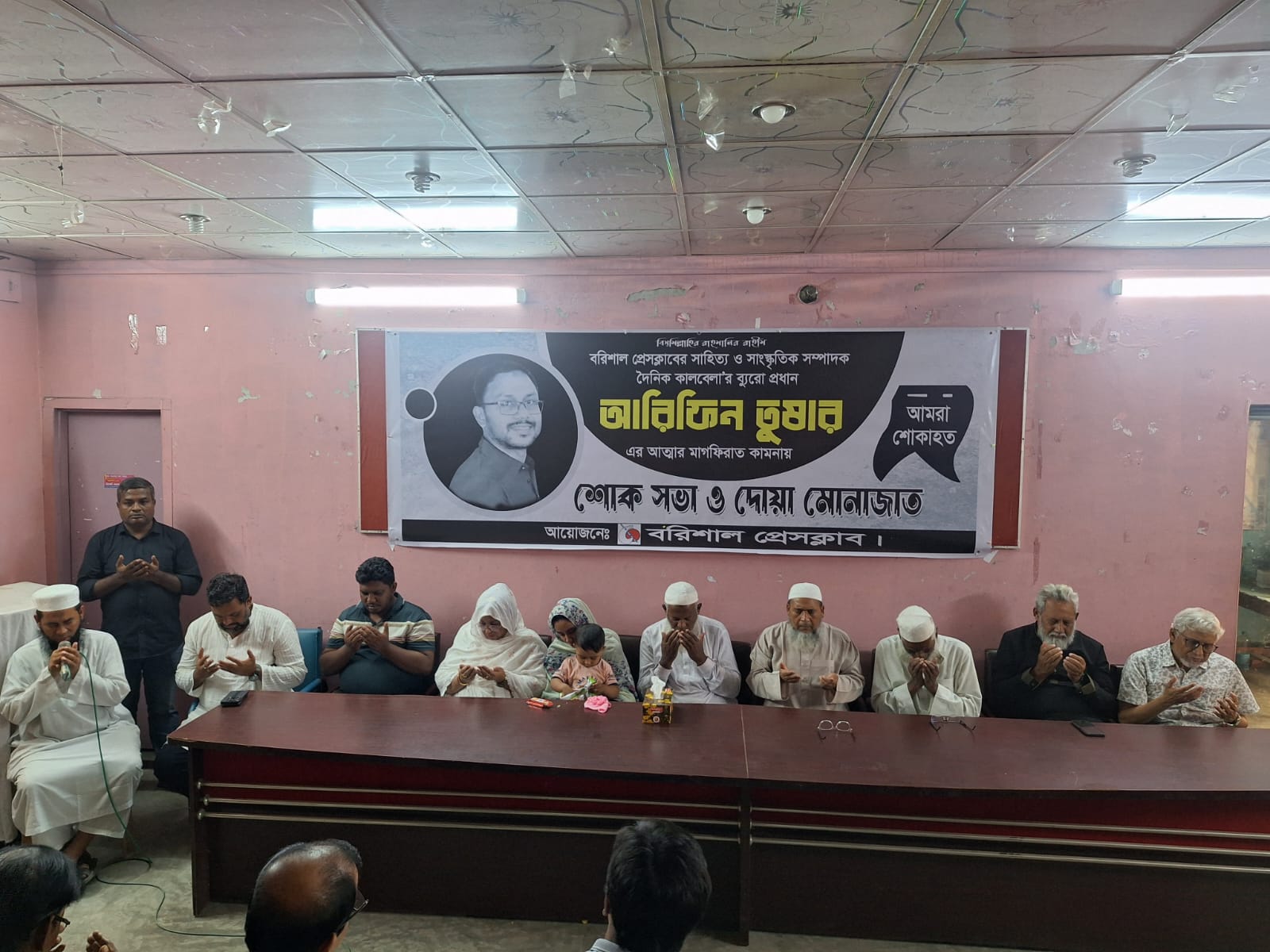 এর আগে পবিত্র কোরআন থেকে তেলাওয়াতের মধ্য দিয়ে শোক সভা শুরু হয়। পরে আরিফিন তুষারের সম্মানে দাঁড়িয়ে এক মিনিট নিরবতা পালন করা হয়। সবশেষ তুষারের রুহের মাগফিরাত কামনা করে দোয়া-মোনাজাত পরিচালনা করেন বরিশাল বাইতুল মোকাররম মসজিদের ইমান মাওলানা মিজানুর রহমান।